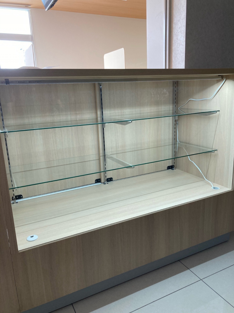 某調剤薬局様向けで店舗カウンターの木製什器を製作しました。 メインの木材加工だけでなく、仕切用のアクリル板加工・取り付けや棚用の金物やガラス棚の手配まで対応が可能です。最終製品の形まで仕上げて納入させていただきます。