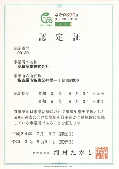 当社ではISO14001を取得し、環境マネジメントシステムを形成しています。また、SDGsの達成へ貢献する事業活動を推進します。