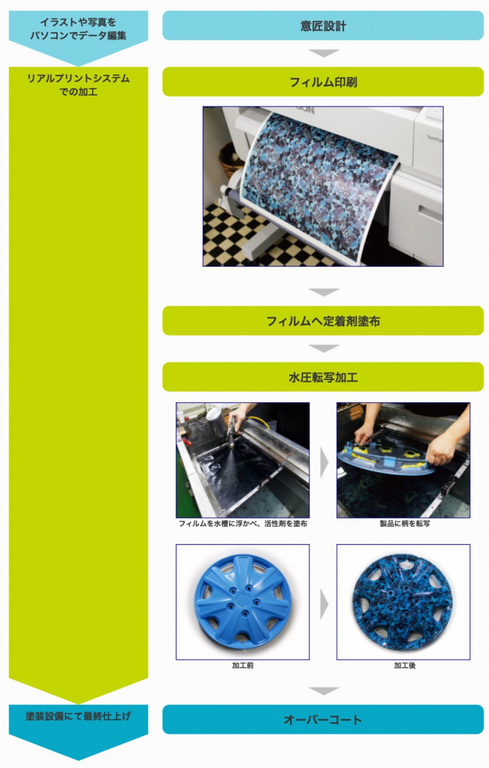 インクジェットプリンターを使用することでパソコンデータから簡単に水圧転写用のフィルムを作ることができます。版が不要のため、試作がイメージ通りできなかった場合もパソコン上で修正するだけでデザイン変更が短時間で可能です。